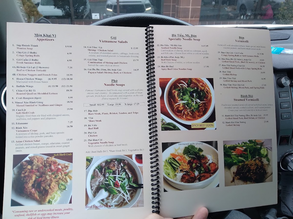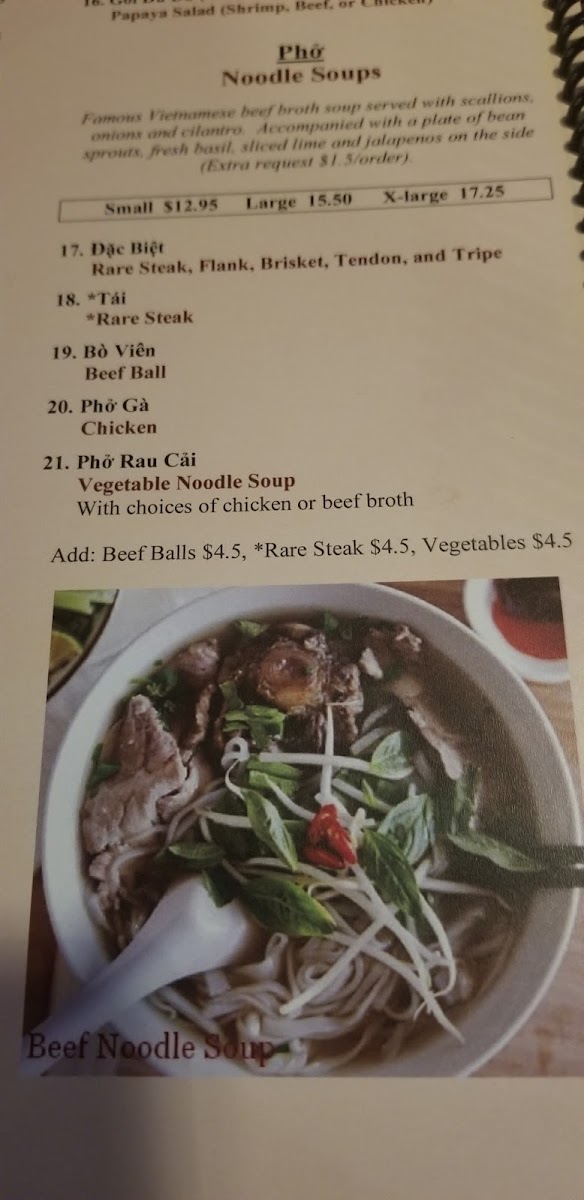 Served with scallions, onions, cilantro and a side bag of bean sprouts, basil, limes and jalapenos.